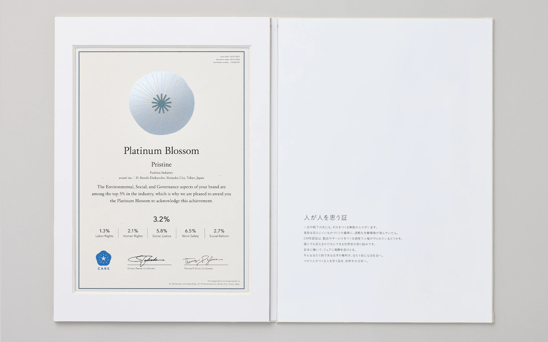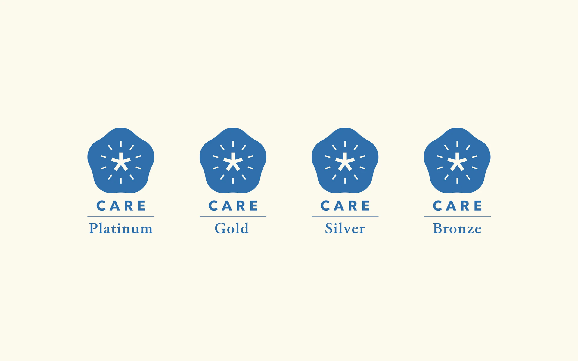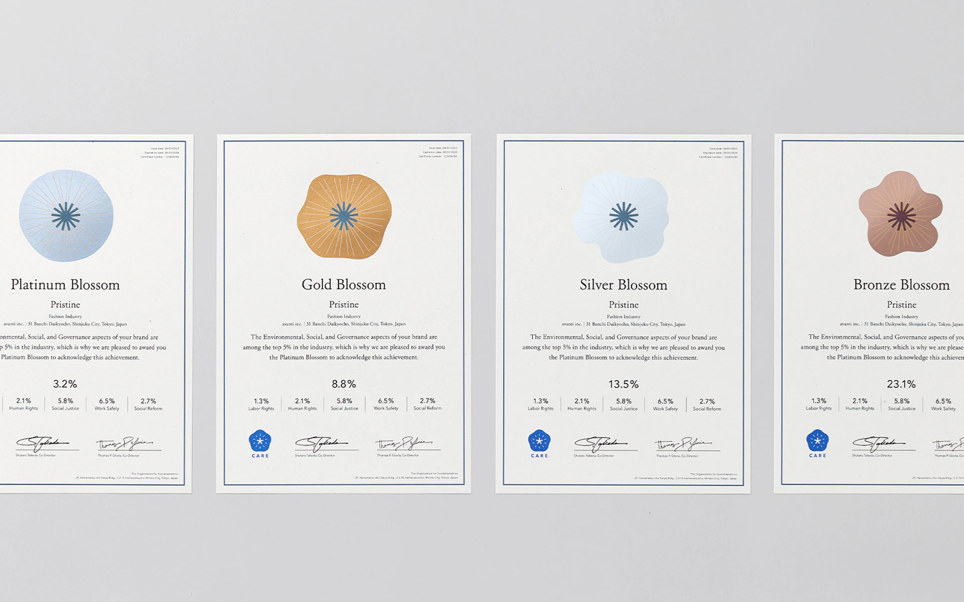 Companies that meet excellent criteria in aiESG’s ranking system are awarded with the CARE Certificate. We designed the blossom shapes from the data analytics of the service, becoming more circular as the ranking advances from Bronze, to Silver, Gold, and Platinum.