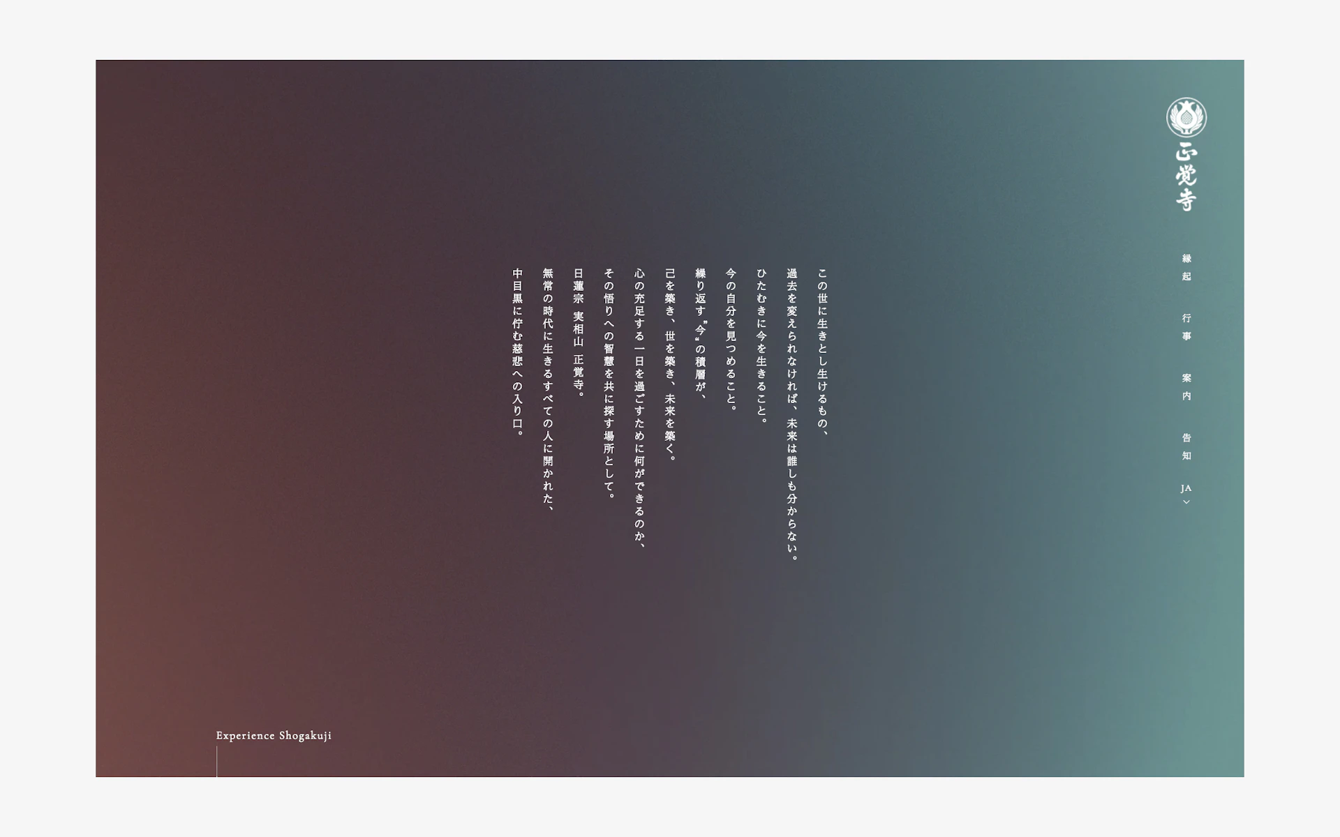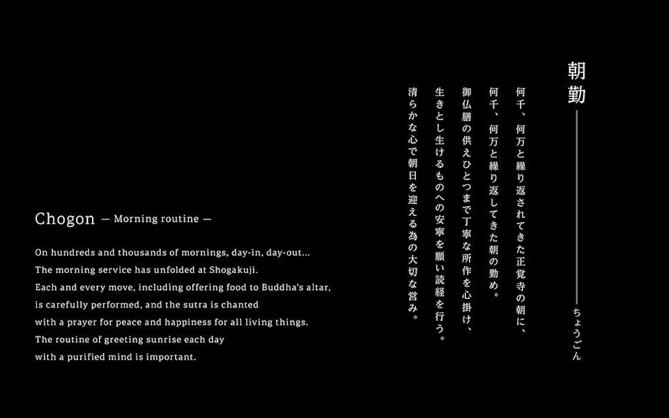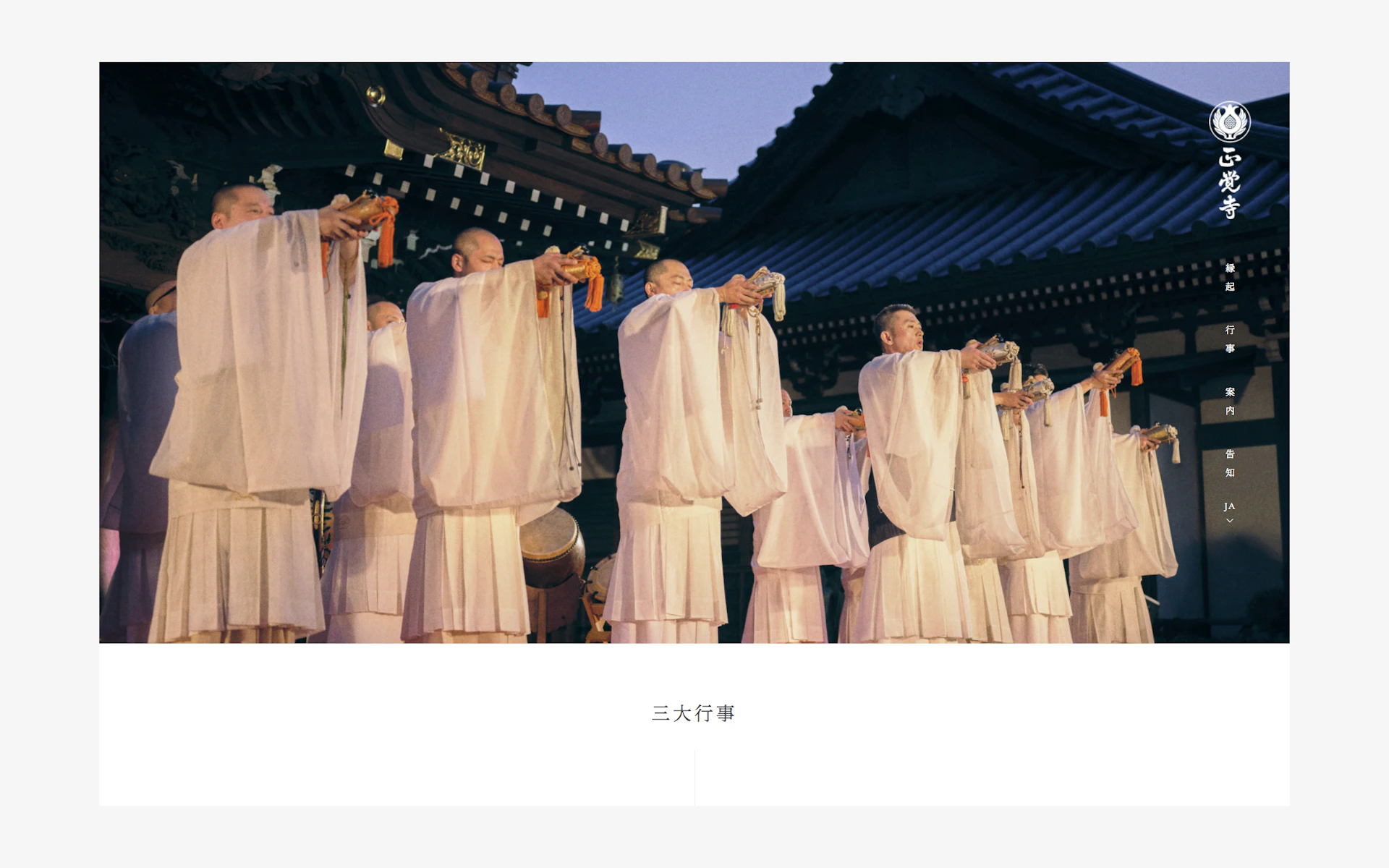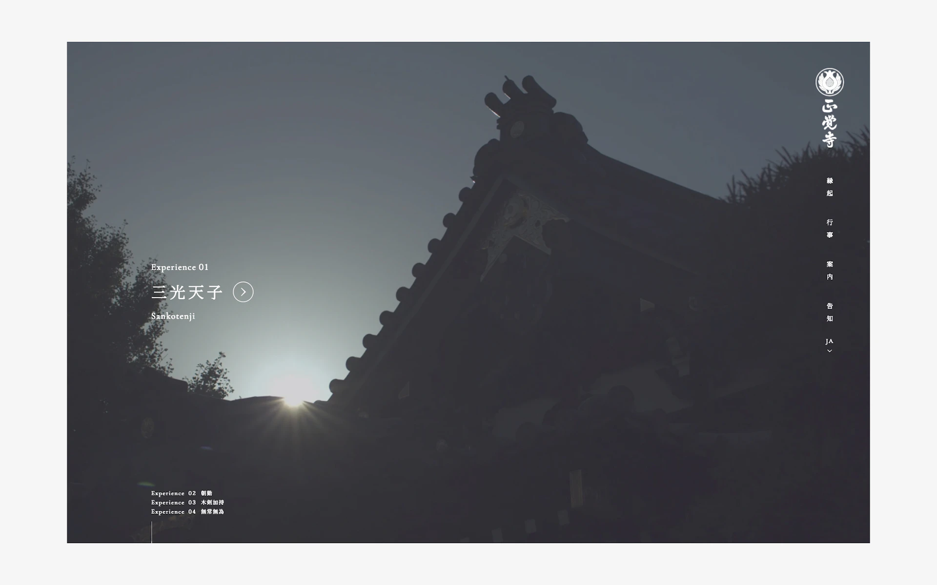 The site allows visitors to experience the temple's unique atmosphere — the peaceful time flowing through the grounds, the morning rituals passed down for 400 years, and the prayer ceremonies performed only by monks who have completed ascetic training. Through interactive main visuals, videos, and social media elements, we achieved an experiential design that can be felt, watched, and read.