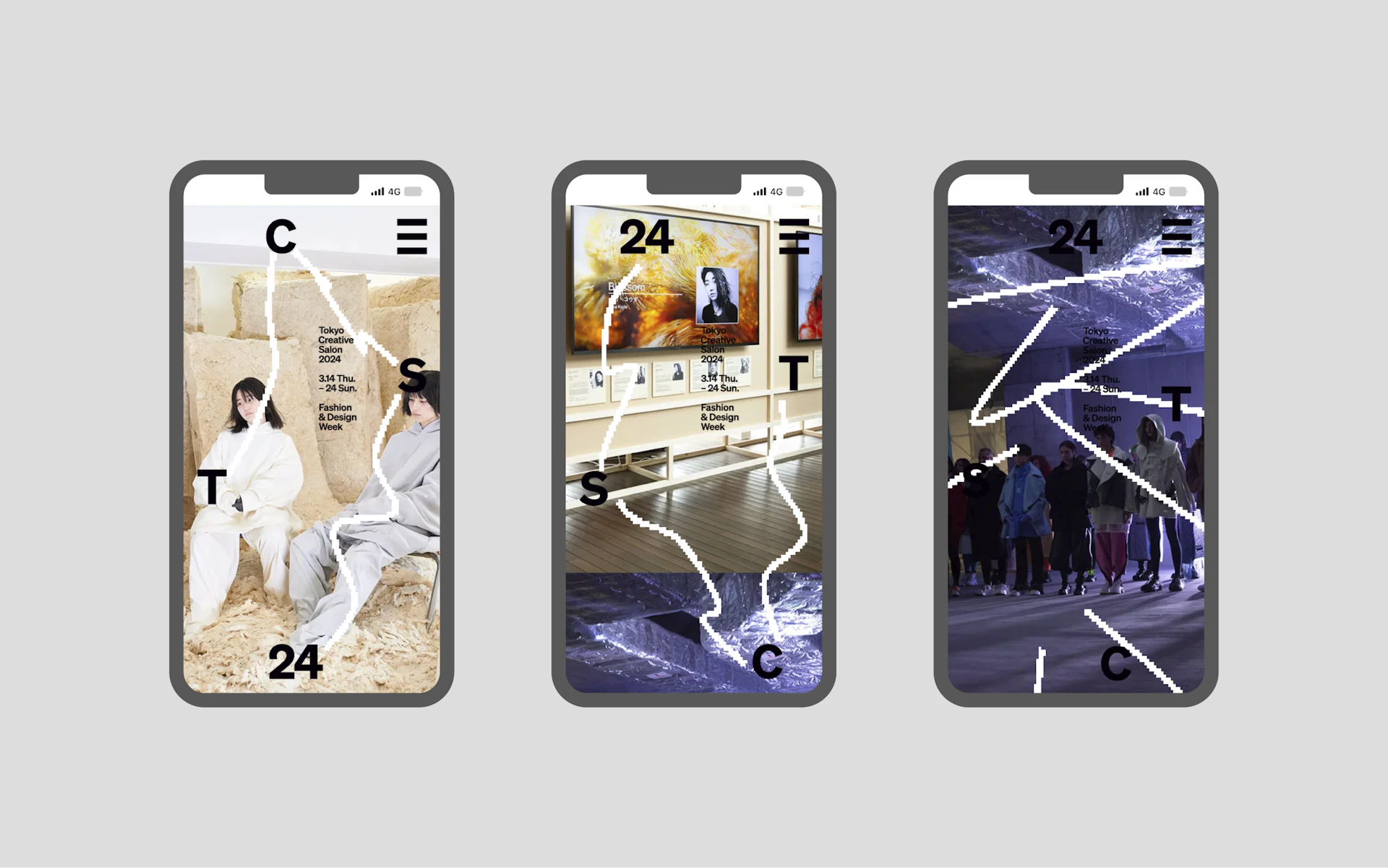 We developed a visual system that connects the letters “T,” “C,” “S” with the event year and area code like a constellation. The dynamic key visual—boldly drawn with rough lines that fill the entire canvas—creates a strong identity that stands out even amid Tokyo’s bustling crowds.