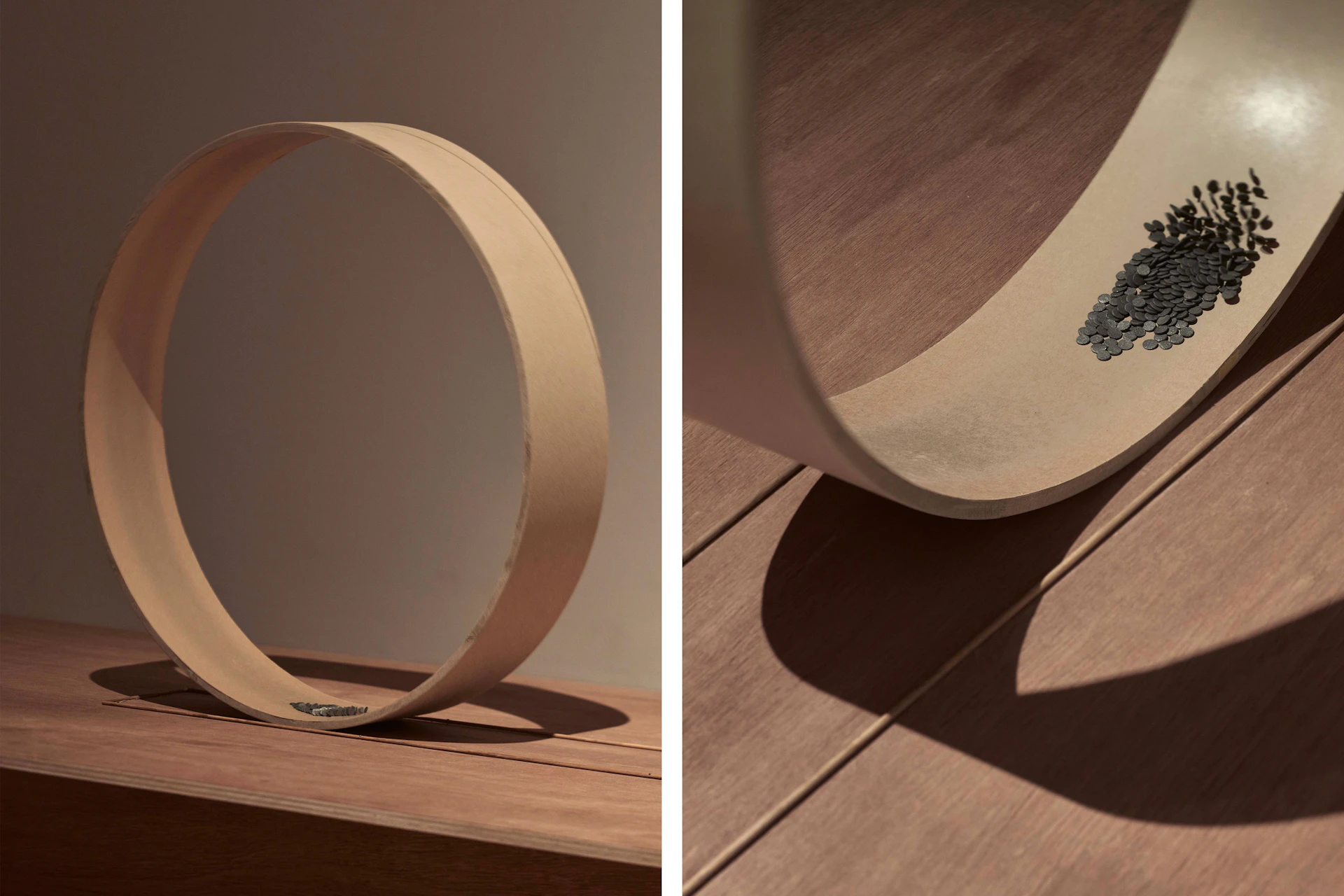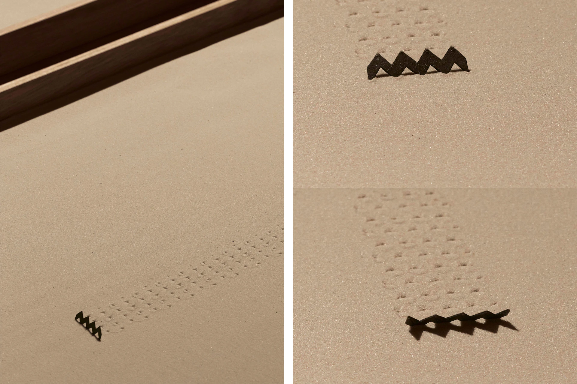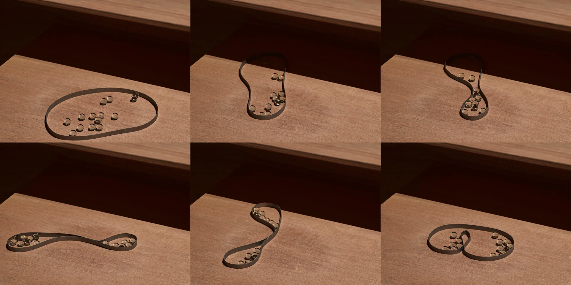 Sand grains. Marble curves. Acrylic clarity. Nail silhouettes. Thin spaces between stacked papers. As small papers move around materials, the hidden “essence” of ordinary things emerges. We discover lovable qualities in what we thought we knew, but never truly saw.
