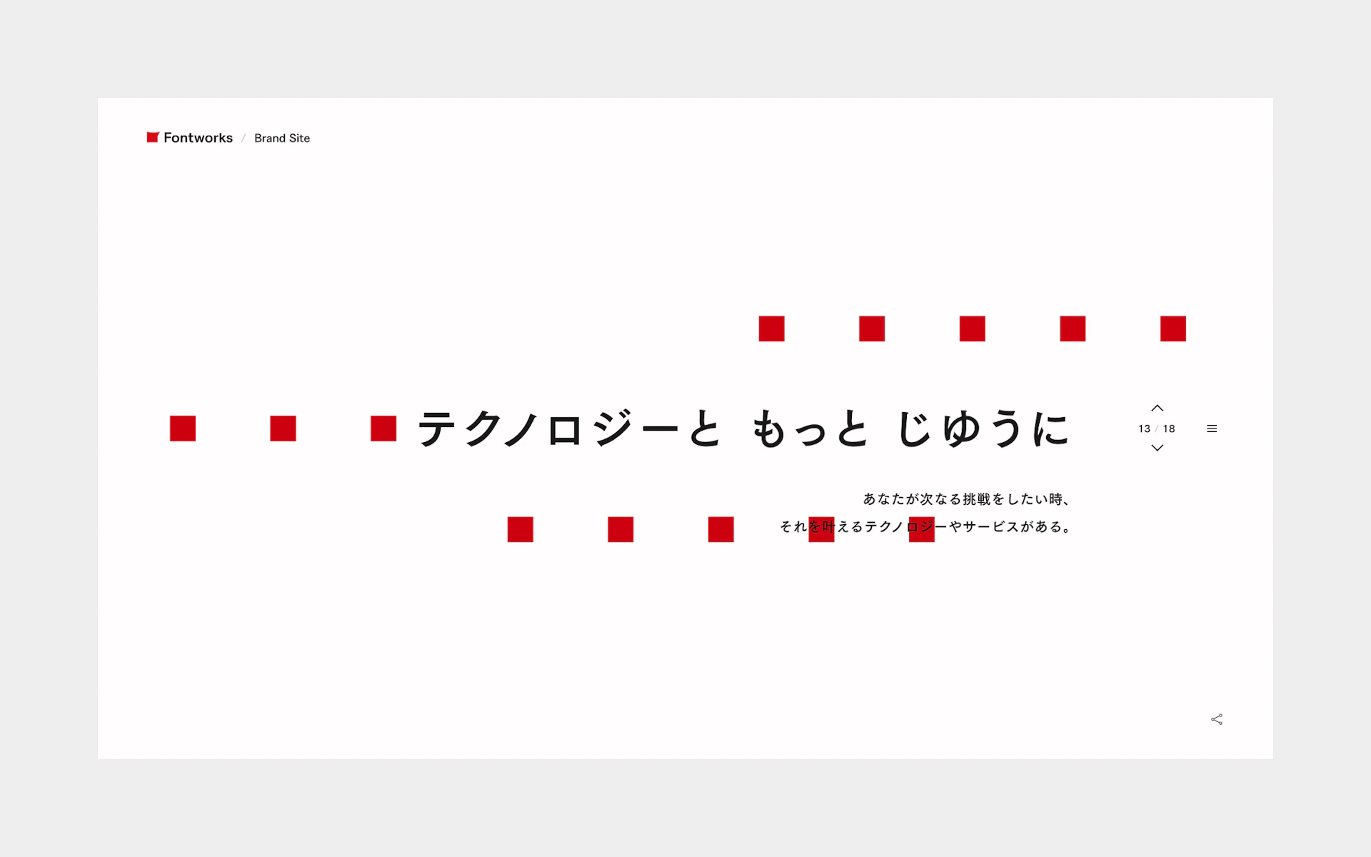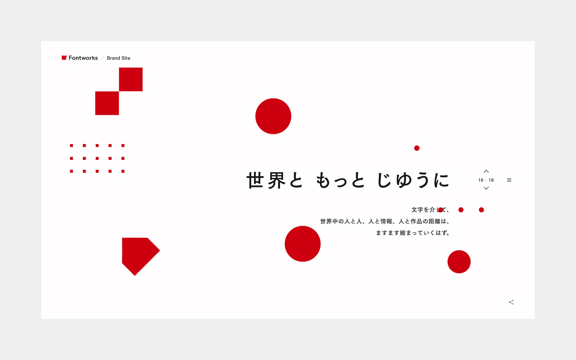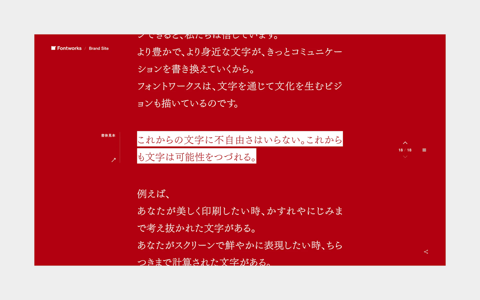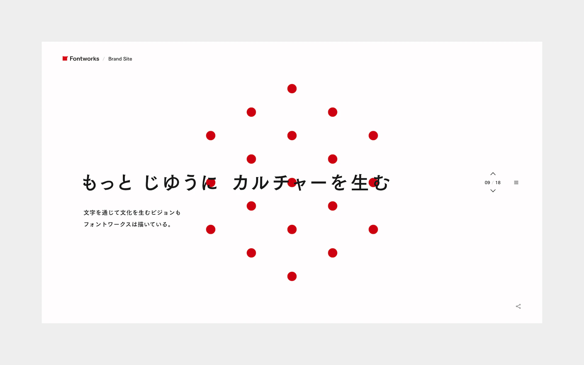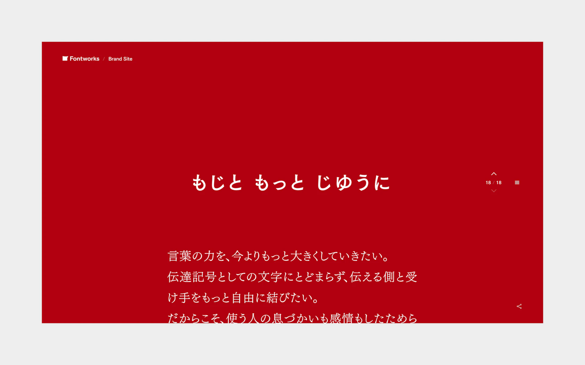 フォントワークスのタグライン「もじと もっと じゆうに」を、どこよりも大切に扱ったブランドサイトを制作。「もじと もっと じゆうに」を紐解いた16の言葉には、同社の想いを込めただけでなく、それを裏付けるファクト(商品・サービス等)を関連付け、ユーザーとの距離感も近づけようとしています。