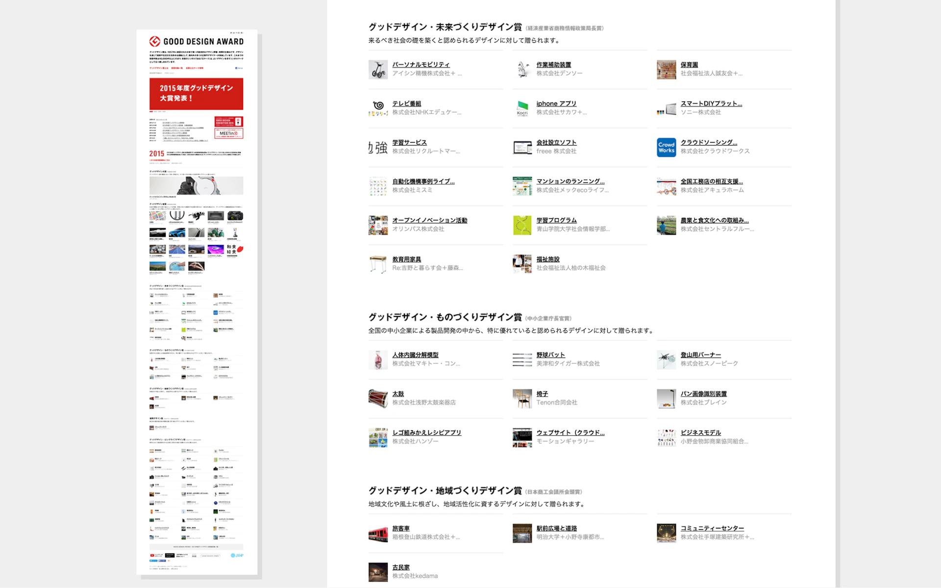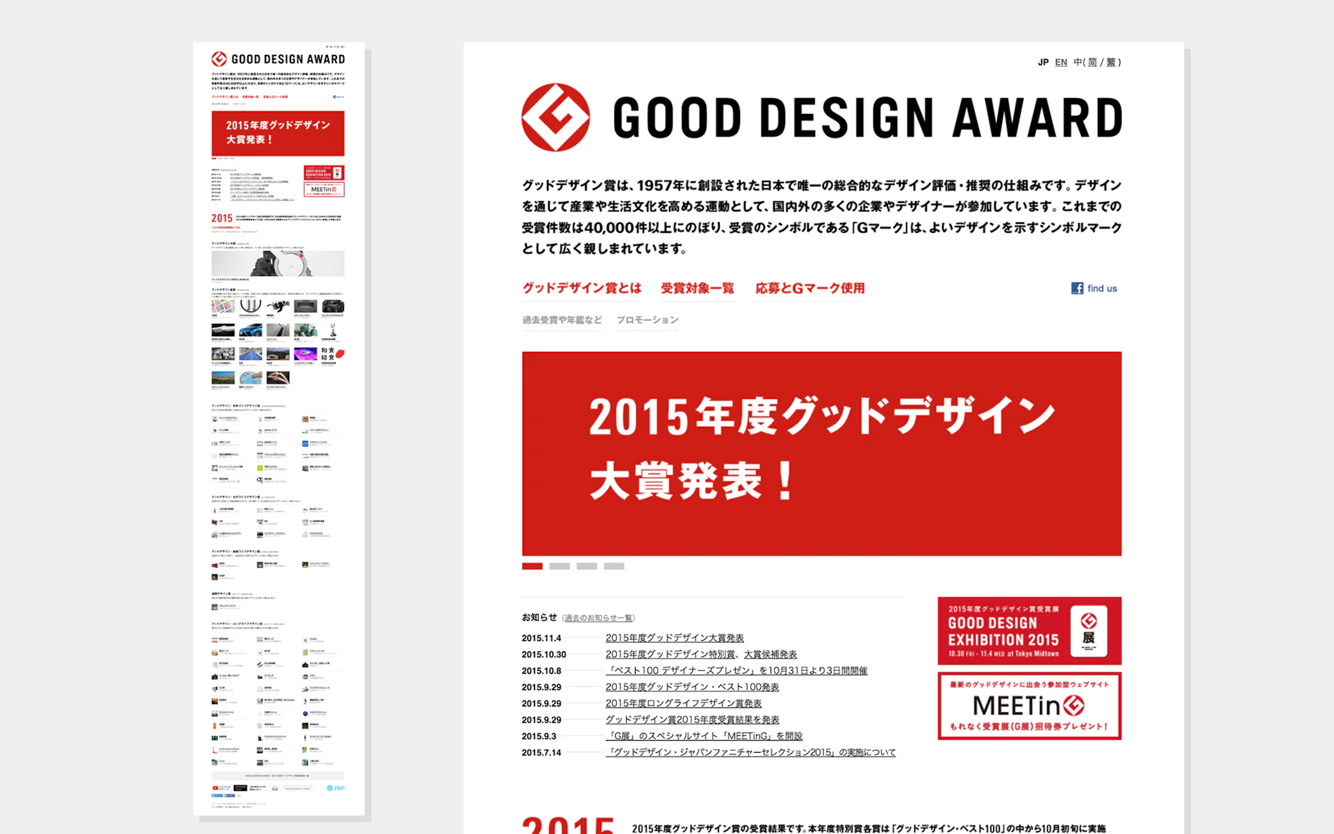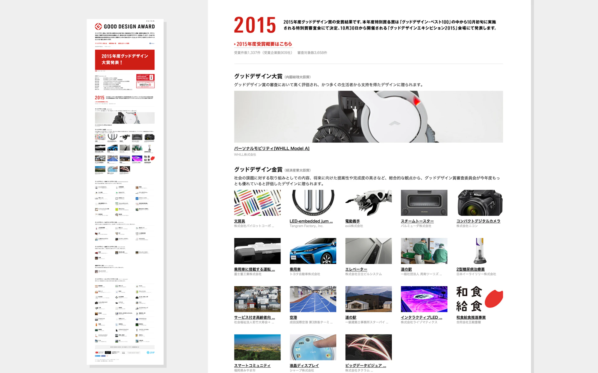 公益財団法人日本デザイン振興会「グッドデザイン賞」のサイトをリニューアルしました。サイトの位置付けを変更し、応募・選定のための事務的なサイトからデザインに関心の高い一般の閲覧者に向けたものにしています。過去から今日までの優れた選定品を自在に閲覧することのできる、わかりやすくシンプルなサイトです。