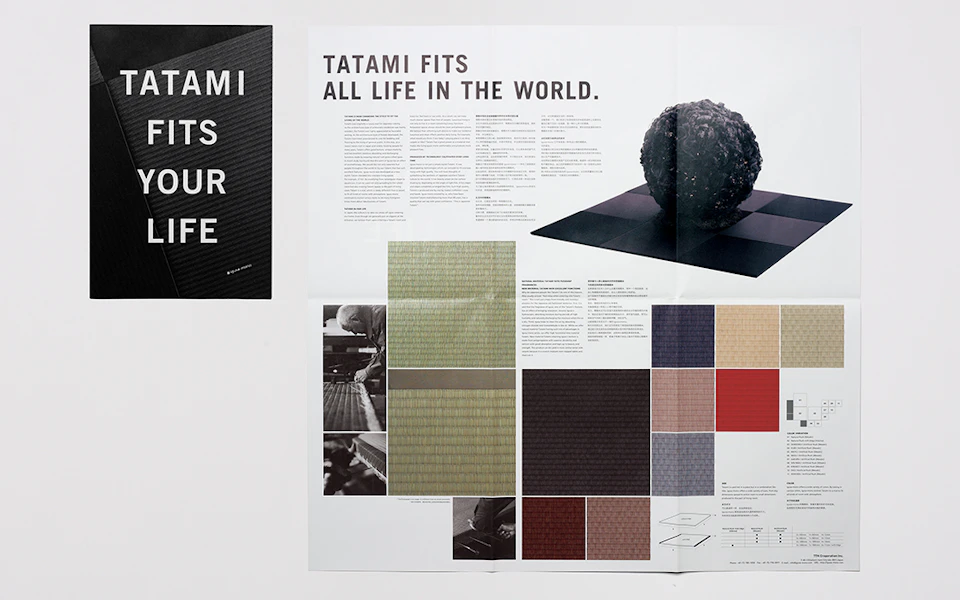 「igusa mono」は、そんな市場背景のなかで畳の新たなかたちを追求するブランド。展示会では、現代の暮らしや欧米の住まいに溶け込むことをめざすブランドフィロソフィーや商品デザインを、より魅力的に伝える手段としてポスターとリーフレットを制作しました。