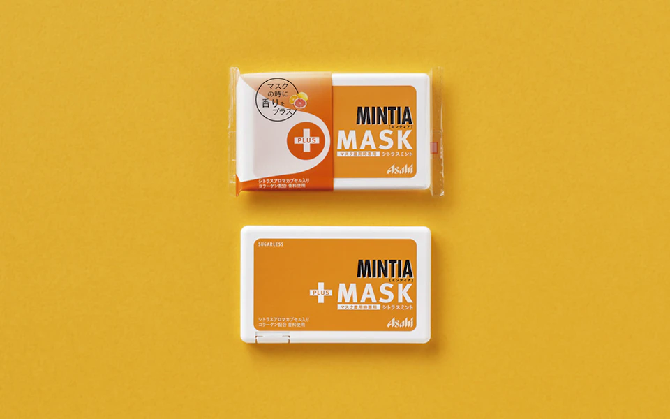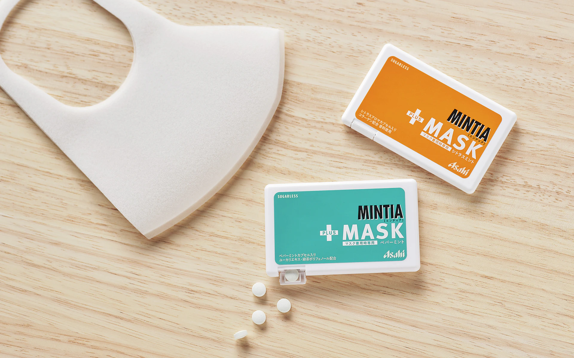 フルーツやミント系の風味を楽しめるタブレット菓子「MINTIA」から、2021年3月のコロナ禍に発売された「MINTIA+MASK シトラスミント」「MINTIA+MASK ペパーミント」のパッケージです。