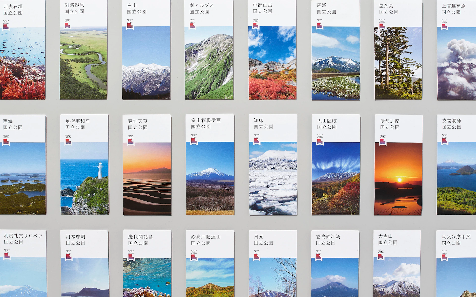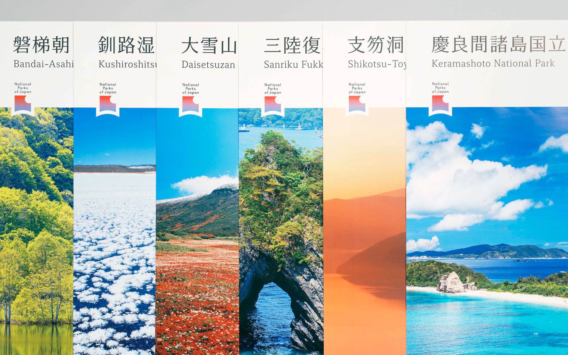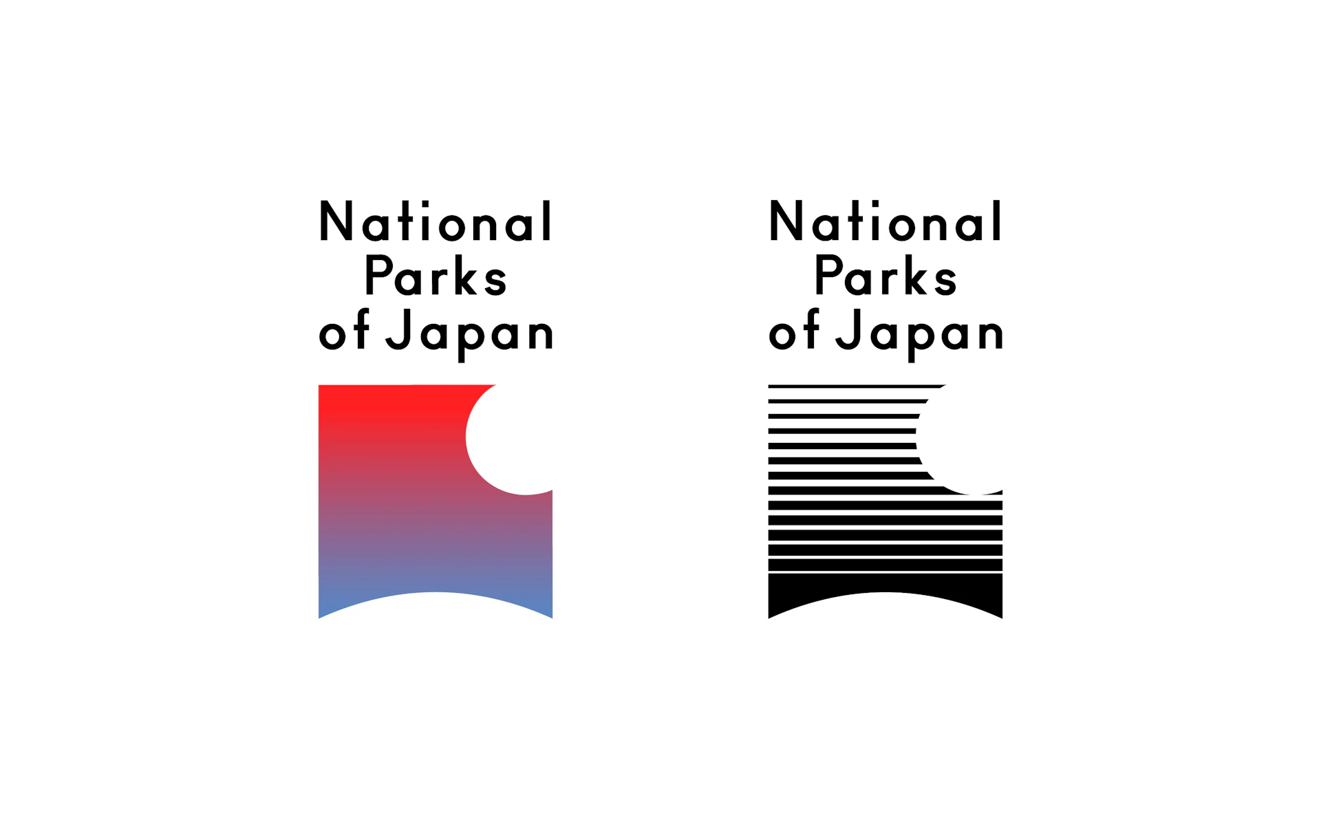 全国の国立公園を日が昇る瞬間の霞みがかった日本独自の空で繋いだ統一シンボル。公園の外ではフルカラーでしっかりと公園の魅力を伝え、公園の中では単色を用いて美しい風景の引き立て役に徹しています。