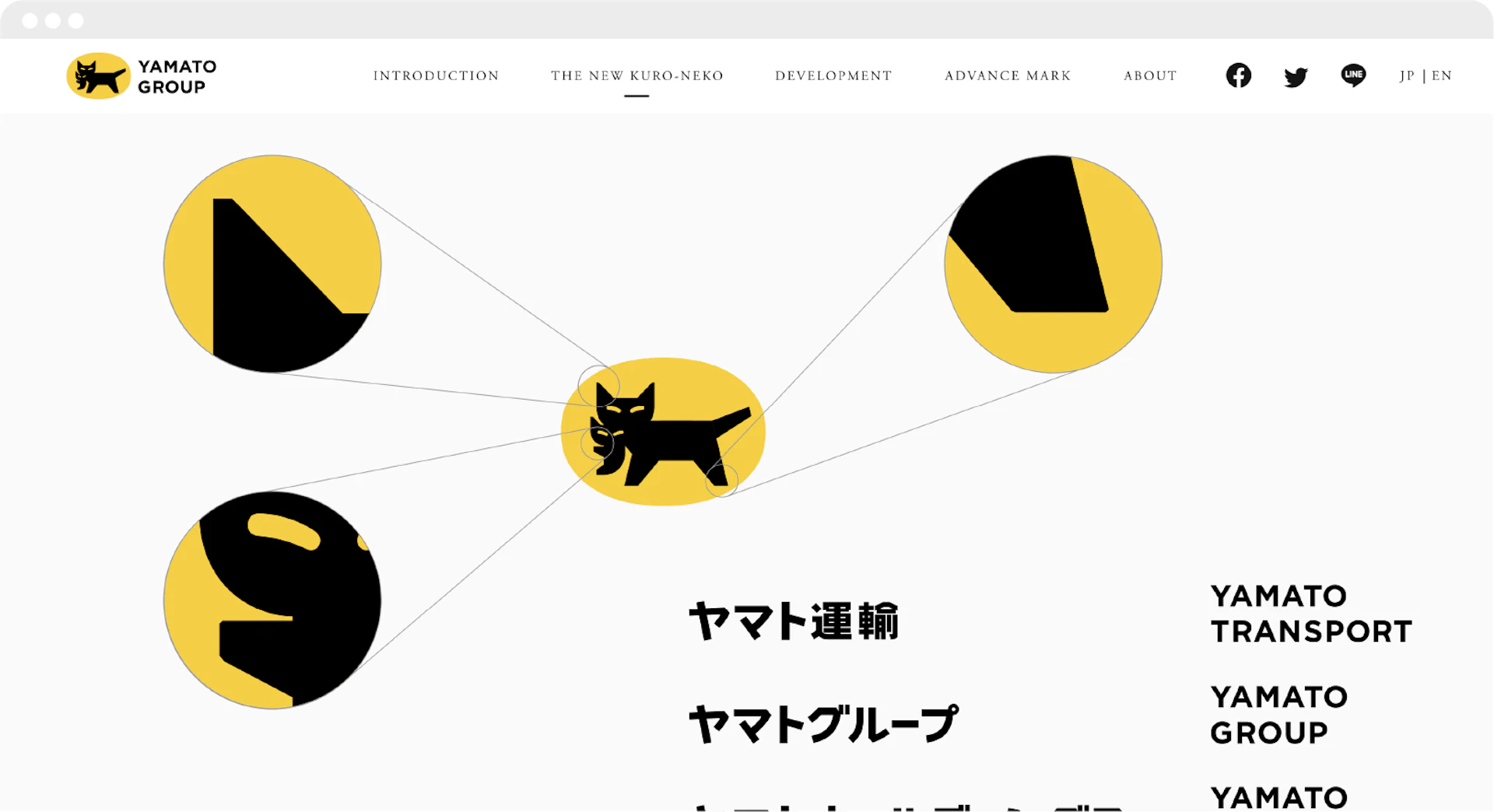 雅玛多集团自创立以来,已逾百年支撑着日本的物流业,随着时代的进步,服务不断加速与扩展。为此,公司决定更新企业标志。叼着小猫谨慎运送的“黑猫标志”已成为日本的共同财产,在数量和密度上,堪称一种环境设计的象征。在继承这一精髓的基础上,我们将其打磨成更加符合这家不断迈向未来的企业形象的造型。